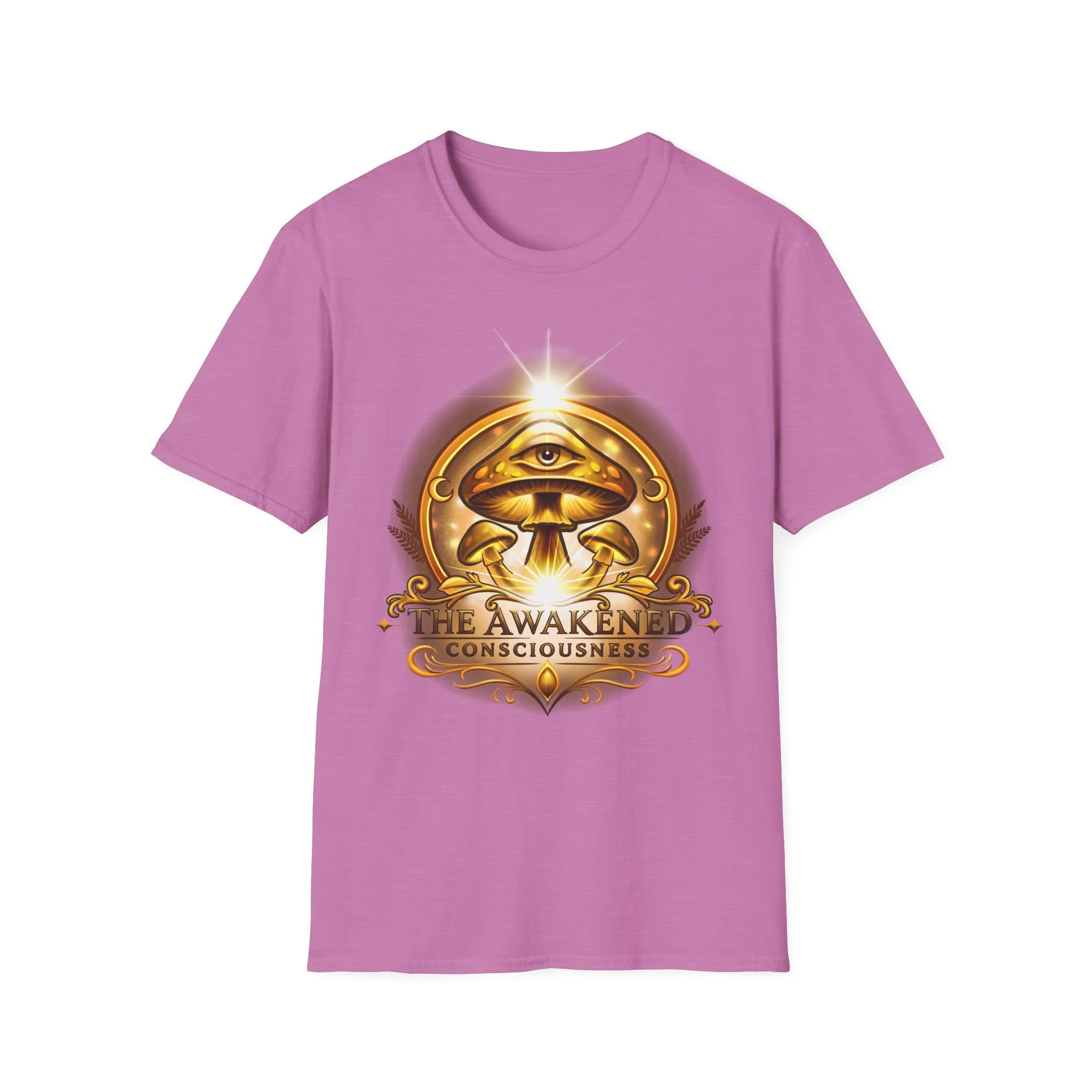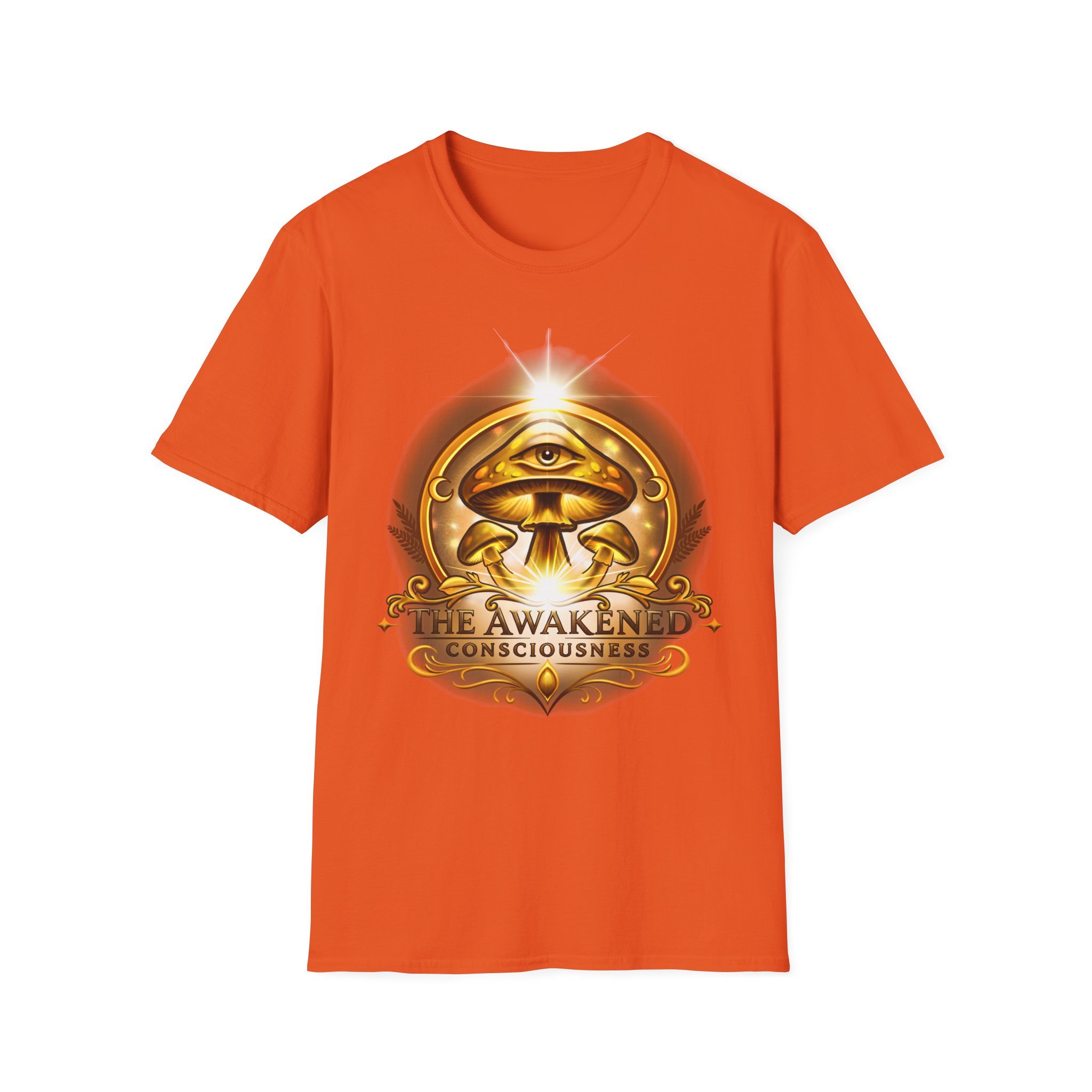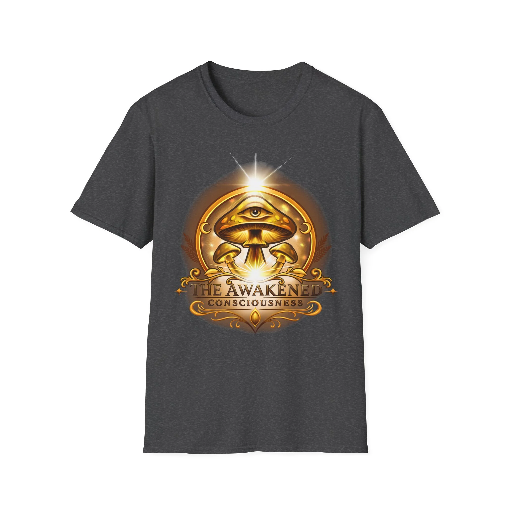 This lightweight cotton tee carries a warm, golden emblem that feels like a talisman — an all-seeing eye above concentric mushrooms and the words “Awaken Consciousness.” It settles softly on the body, breathable and smooth, so the artwork becomes the quiet focal point of your outfit. Wear it while you’re sketching plans by lamplight, walking to a moonlit gathering, or lounging with friends who trade ideas about inner growth. The design speaks to curiosity and quiet ritual, inviting conversation without shouting. The shirt’s clean crew neck and classic fit make it easy to layer under a jacket or wear solo when you want to let the emblem sit front and center.