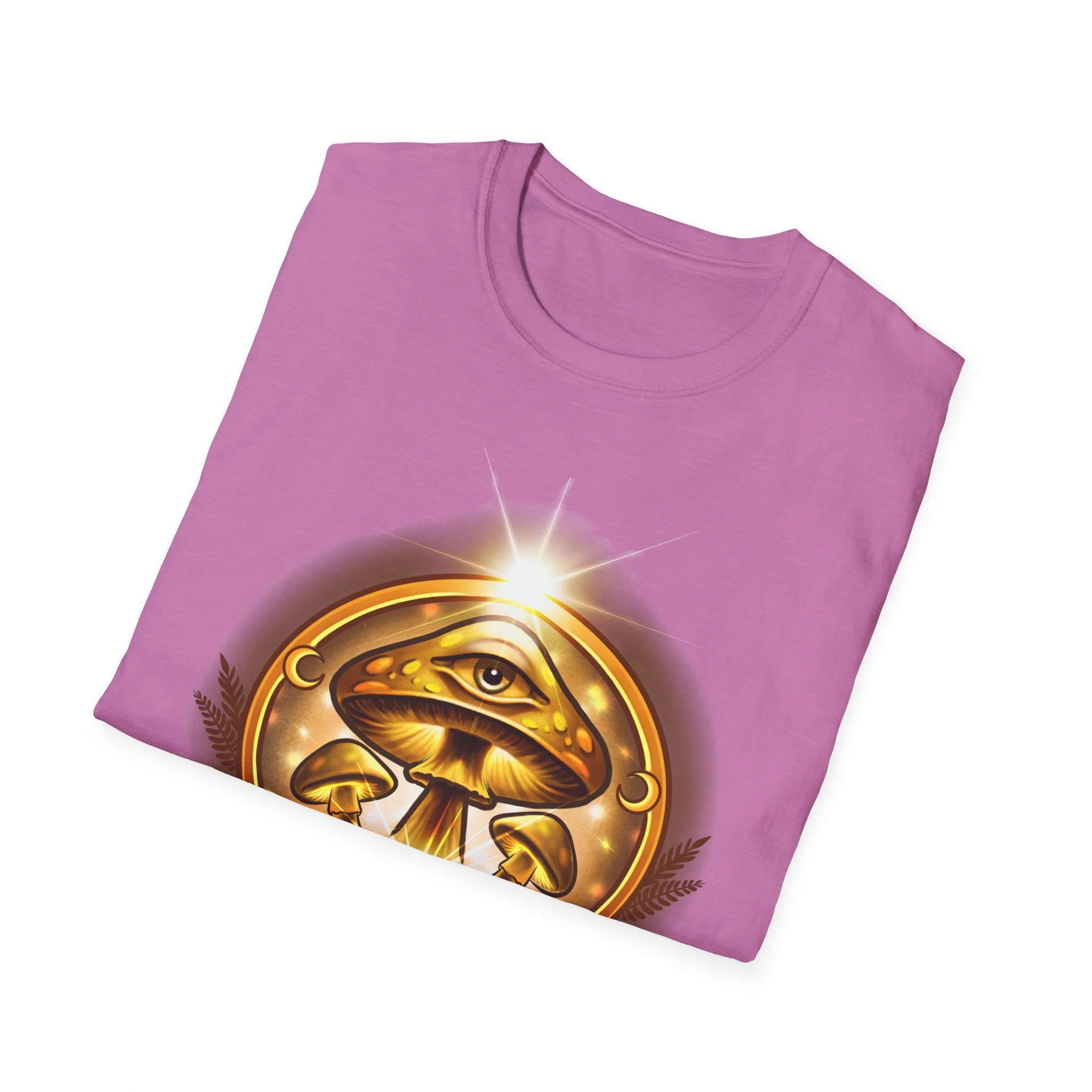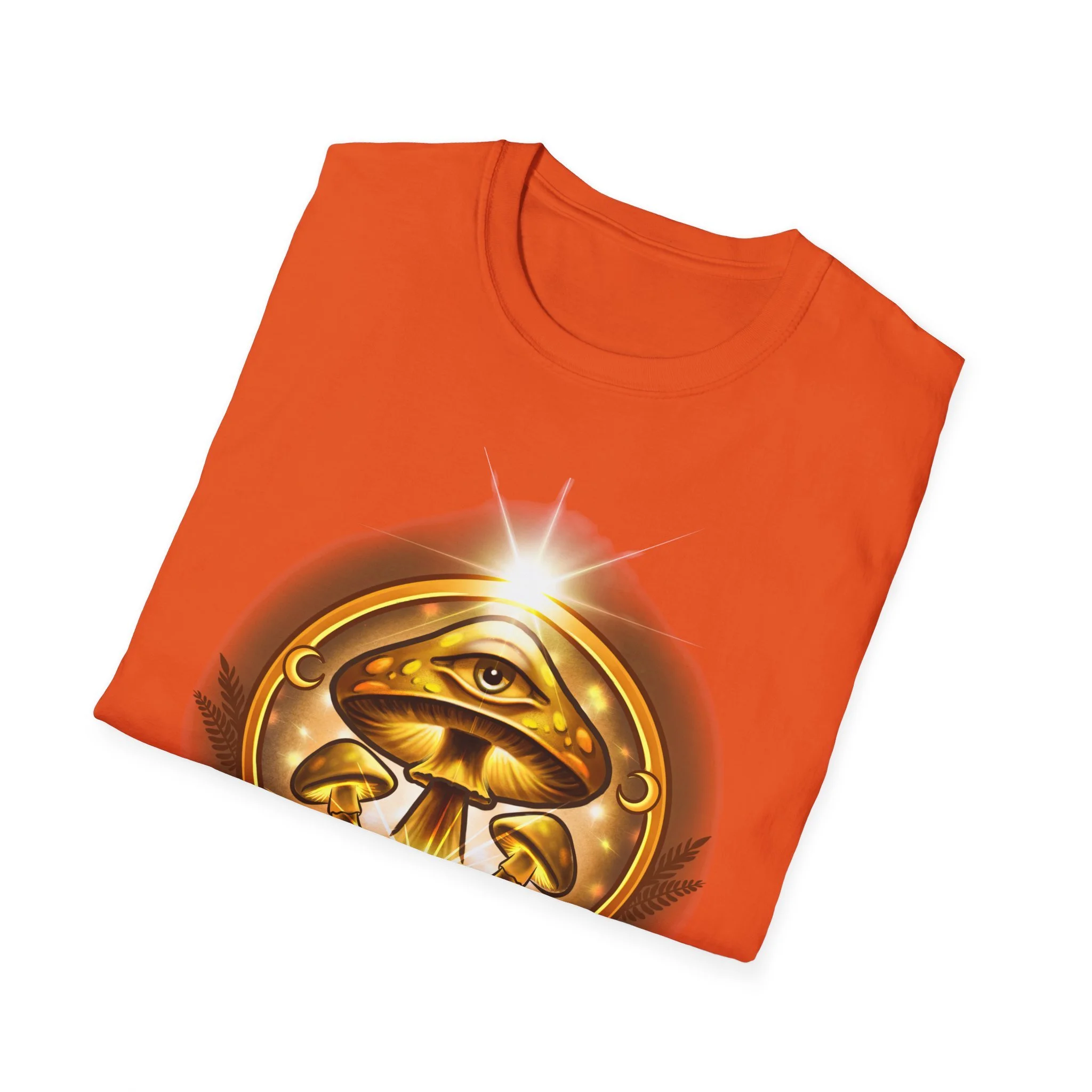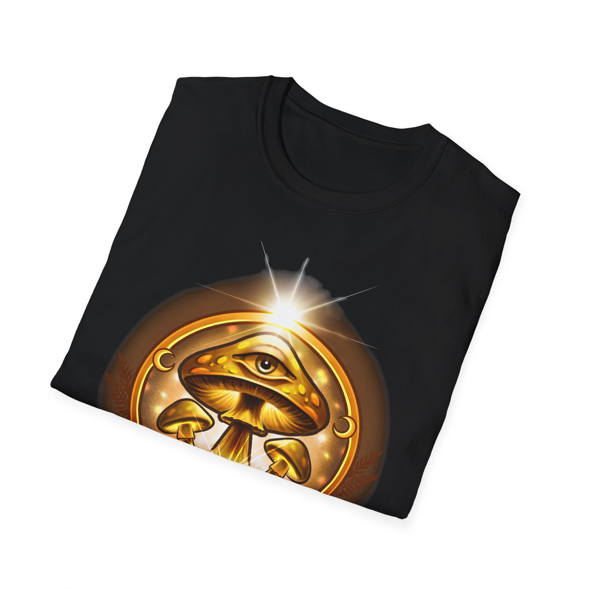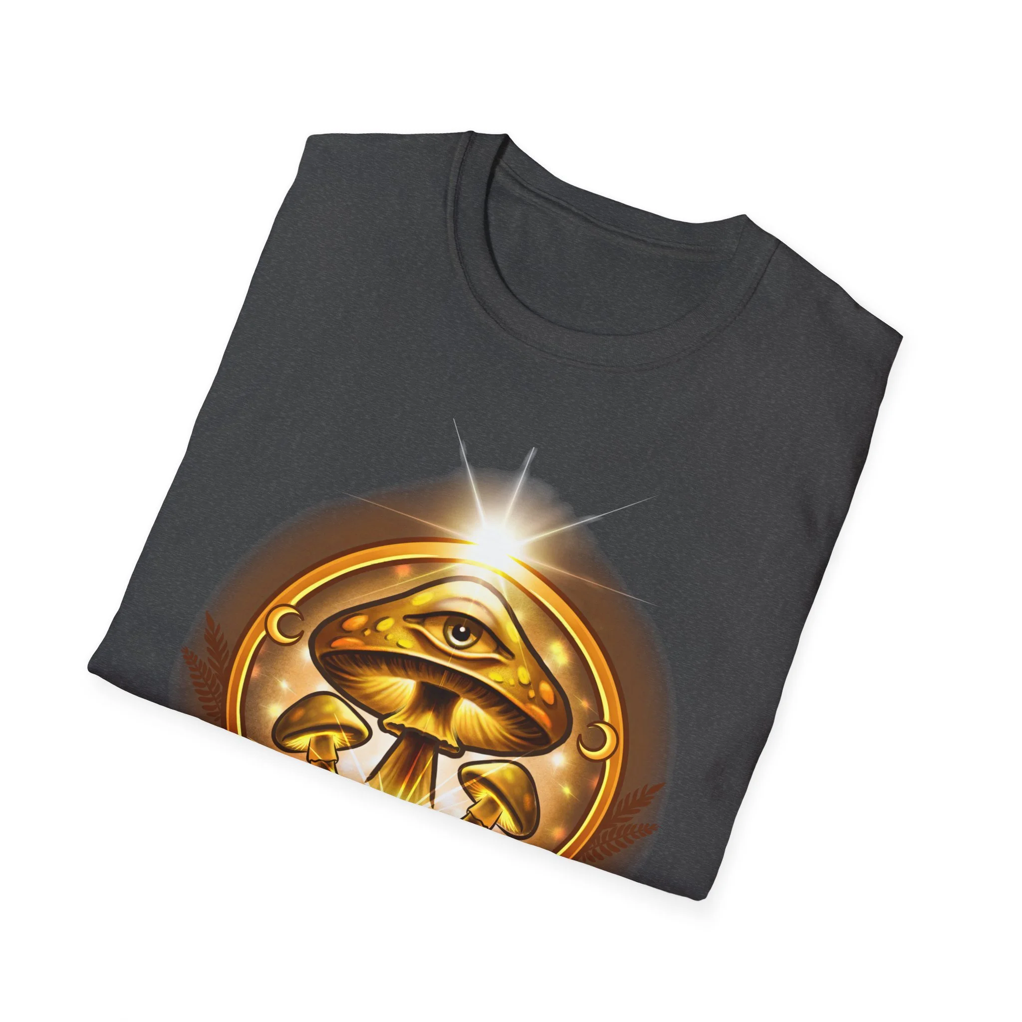 This lightweight cotton tee carries a warm, golden emblem that feels like a talisman — an all-seeing eye above concentric mushrooms and the words “Awaken Consciousness.” It settles softly on the body, breathable and smooth, so the artwork becomes the quiet focal point of your outfit. Wear it while you’re sketching plans by lamplight, walking to a moonlit gathering, or lounging with friends who trade ideas about inner growth. The design speaks to curiosity and quiet ritual, inviting conversation without shouting. The shirt’s clean crew neck and classic fit make it easy to layer under a jacket or wear solo when you want to let the emblem sit front and center.