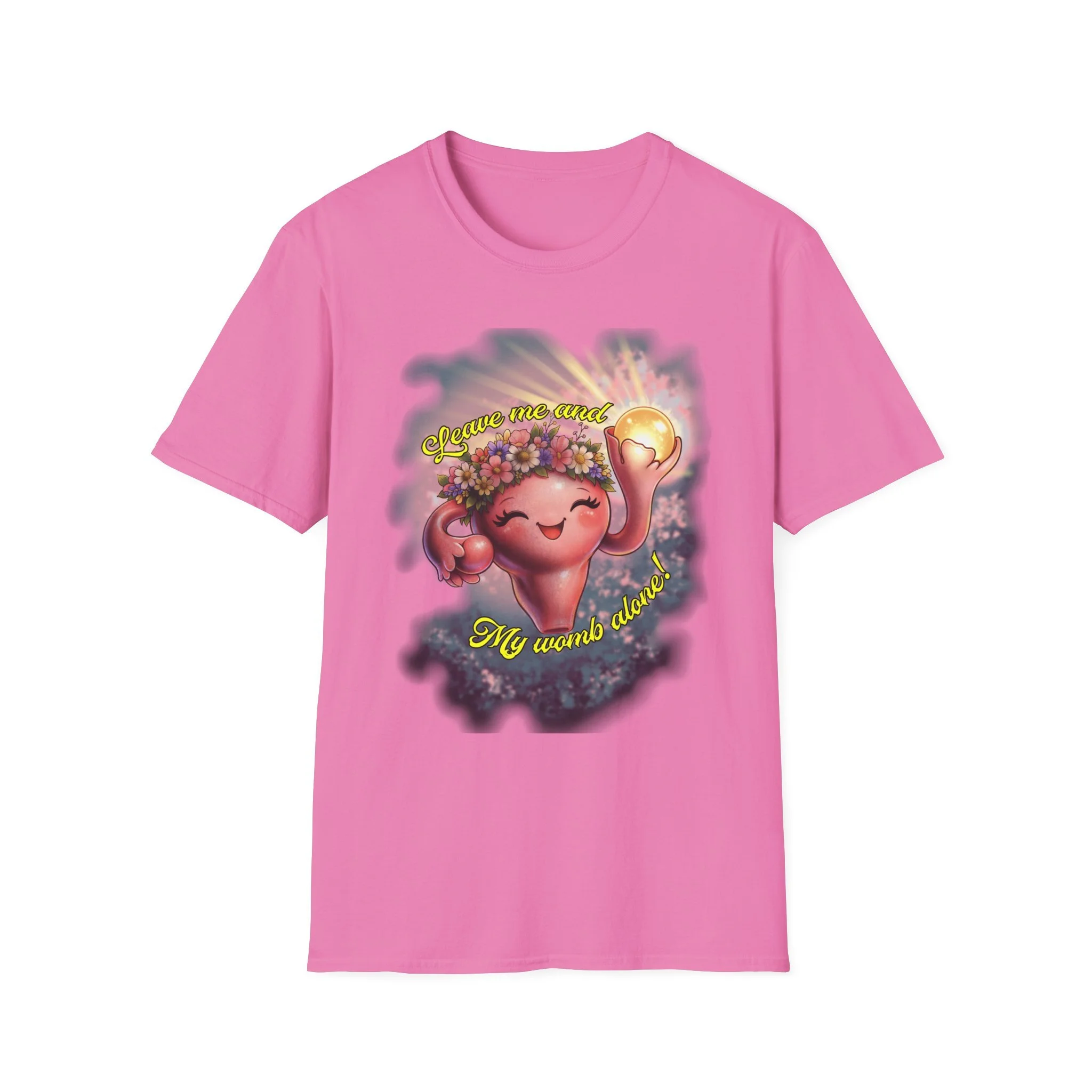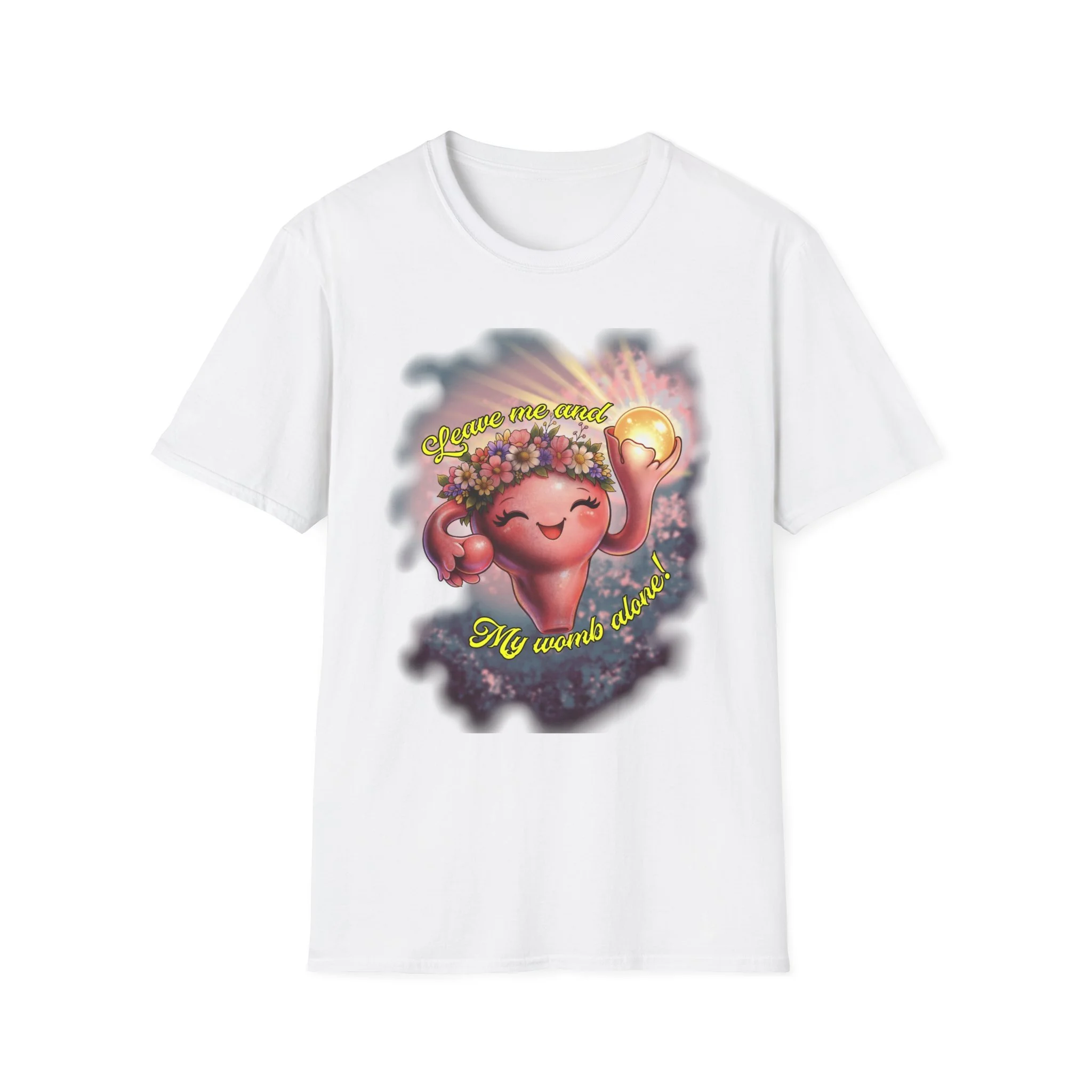 A lightweight, soft cotton tee that brings playful, upbeat energy to everyday wear. The front features a cheerful, cartoon-style heart character crowned with flowers and holding a shining orb, framed by a subtle watercolor background and whimsical lettering. It sits comfortably on the chest without overwhelming the design, letting the art take center stage while the crew neckline and classic cut keep the silhouette familiar and easy to layer. Wear it when you want to add a little joy to errands, coffee dates, or low-key gatherings — it reads like a friendly nod to self-care and gentle confidence.